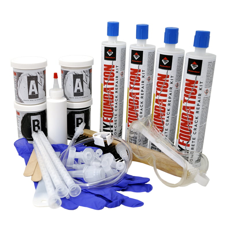 Concrete crack repair kits for foundation walls, concrete floors, control joints, voids, and defects.